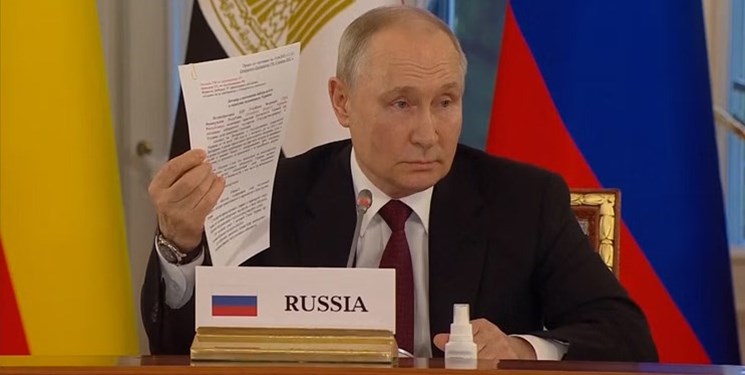 وأوضح بوتين أنه بمجرد انسحاب القوات الروسية من ضواحي كييف في الأسابيع القليلة الأولى من الحرب كبادرة حسن نية، انسحبت أوكرانيا من الاتفاقية. وفسر المسؤولون ووسائل الإعلام الغربية هذا الانسحاب على أنه انتصار لأوكرانيا، وبعد ذلك بدأوا بإرسال أسلحة ومعدات إلى أوكرانيا بهدف هزيمة روسيا استراتيجيا على الأراضي الأوكرانية.