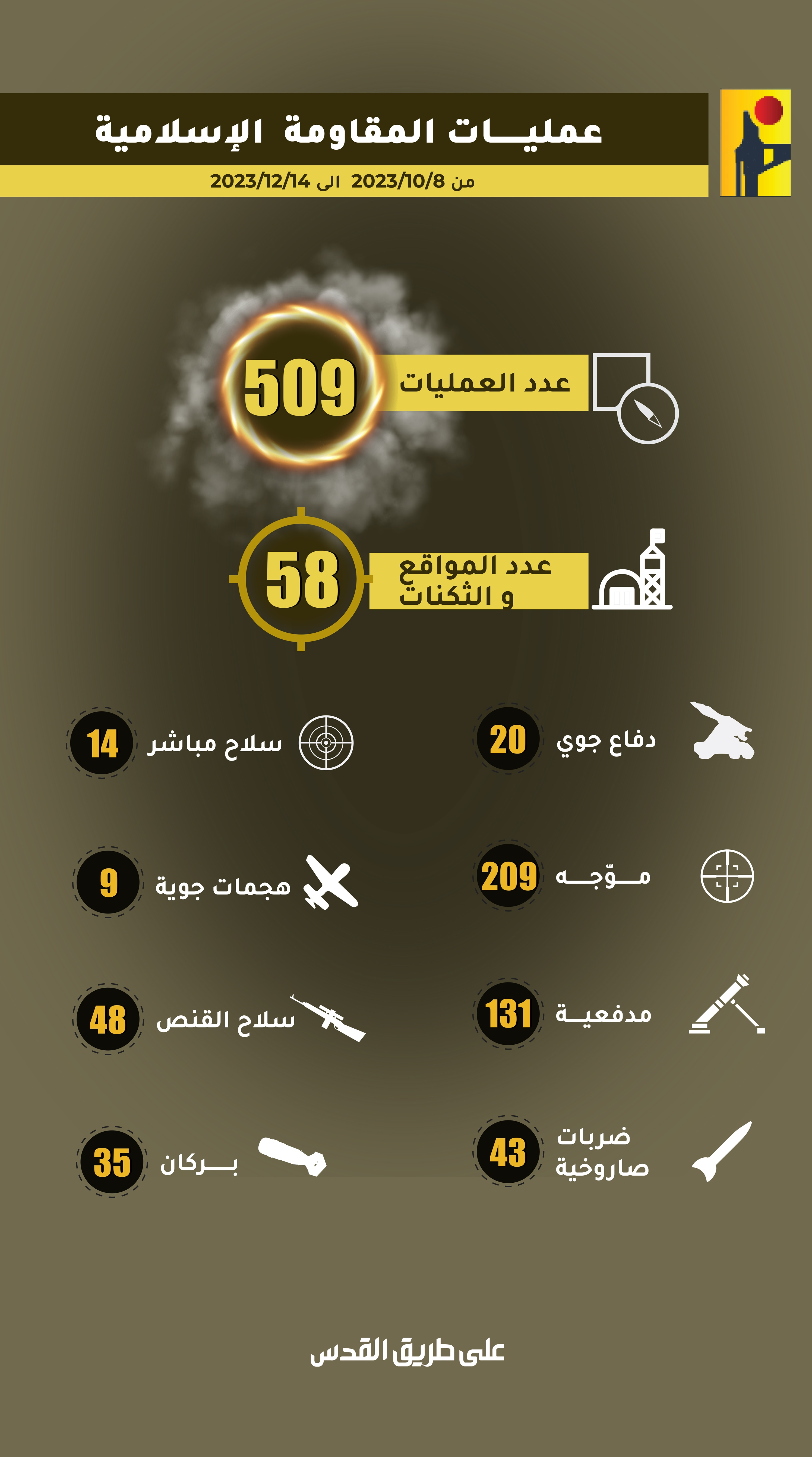 ونشرت المجموعة الإعلامية للإعلام العسكري اللبناني إحصائيات عن عدد وتفاصيل هجمات هذه المجموعة المقاومة على مواقع الجيش الصهيوني منذ بداية حرب غزة.