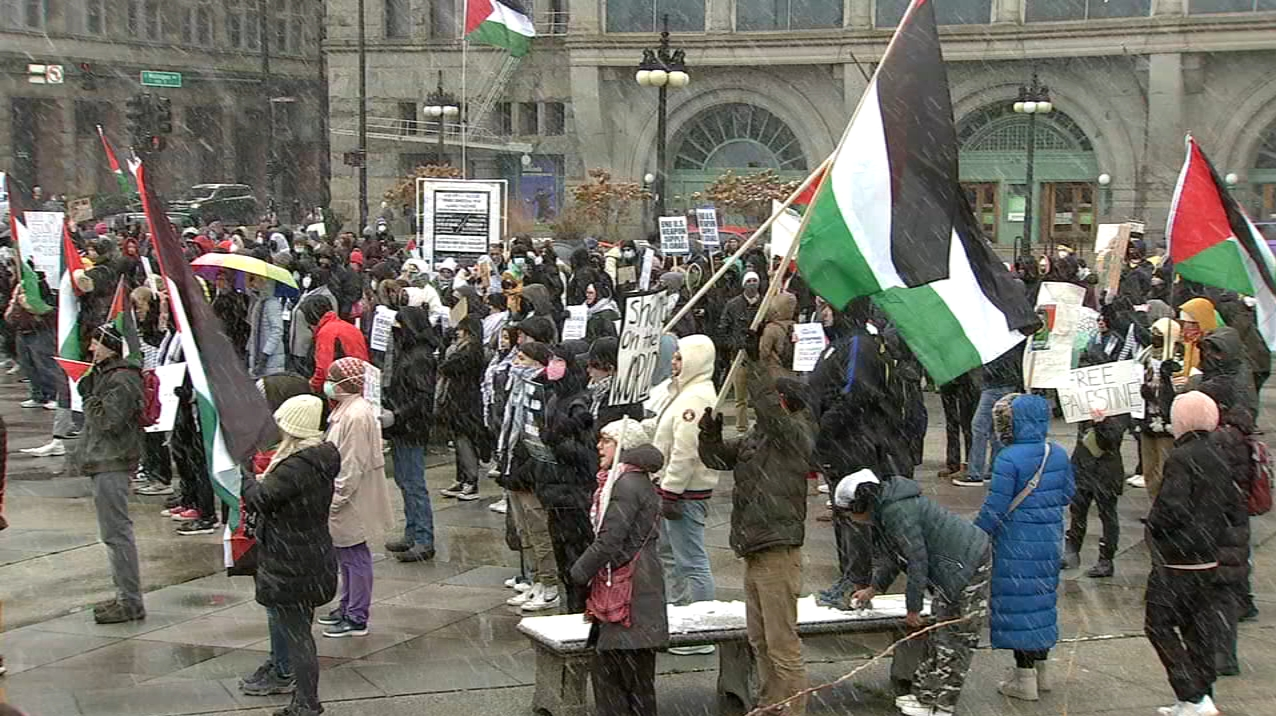 أنصار فلسطين في بوسطن كما قاموا بمسيرة في أمريكا يوم الاثنين وطالبوا بوقف إطلاق النار. ولوح الحاضرون في هذه المظاهرة بالعلم الفلسطيني.