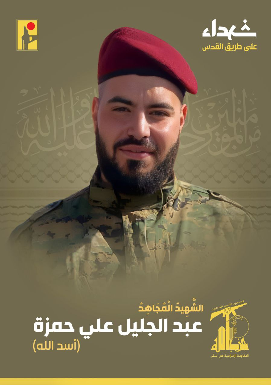 أعلن حزب الله من خلال نشر بيان له أن “عبد الجليل علي حمزة” مجاهد من بلدة الخضر، استشهد وهو في طريقه إلى القدس جراء هجوم للنظام الصهيوني.