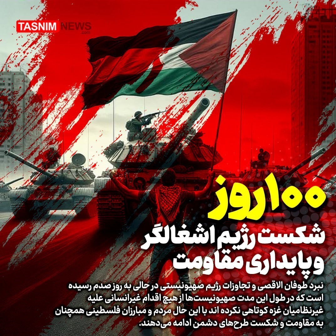 وبحسب المجموعة الدولية وكالة تسنيم للأنباء، فقد مر مائة يوم على بداية معركة عاصفة الأقصى والعدوان.. وحشية النظام الصهيوني ووحشيته ضد المدنيين في قطاع غزة، والشعب الفلسطيني ومقاتليه يواصلون المقاومة وإحباط مخططات العدو الصهيوني.
