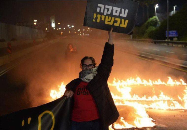 متظاهرون يقطعون شارع أيالون في تل أبيب وطالبوا بالتوقيع الفوري على اتفاق تبادل الأسرى مع حماس وعودة أبنائهم.