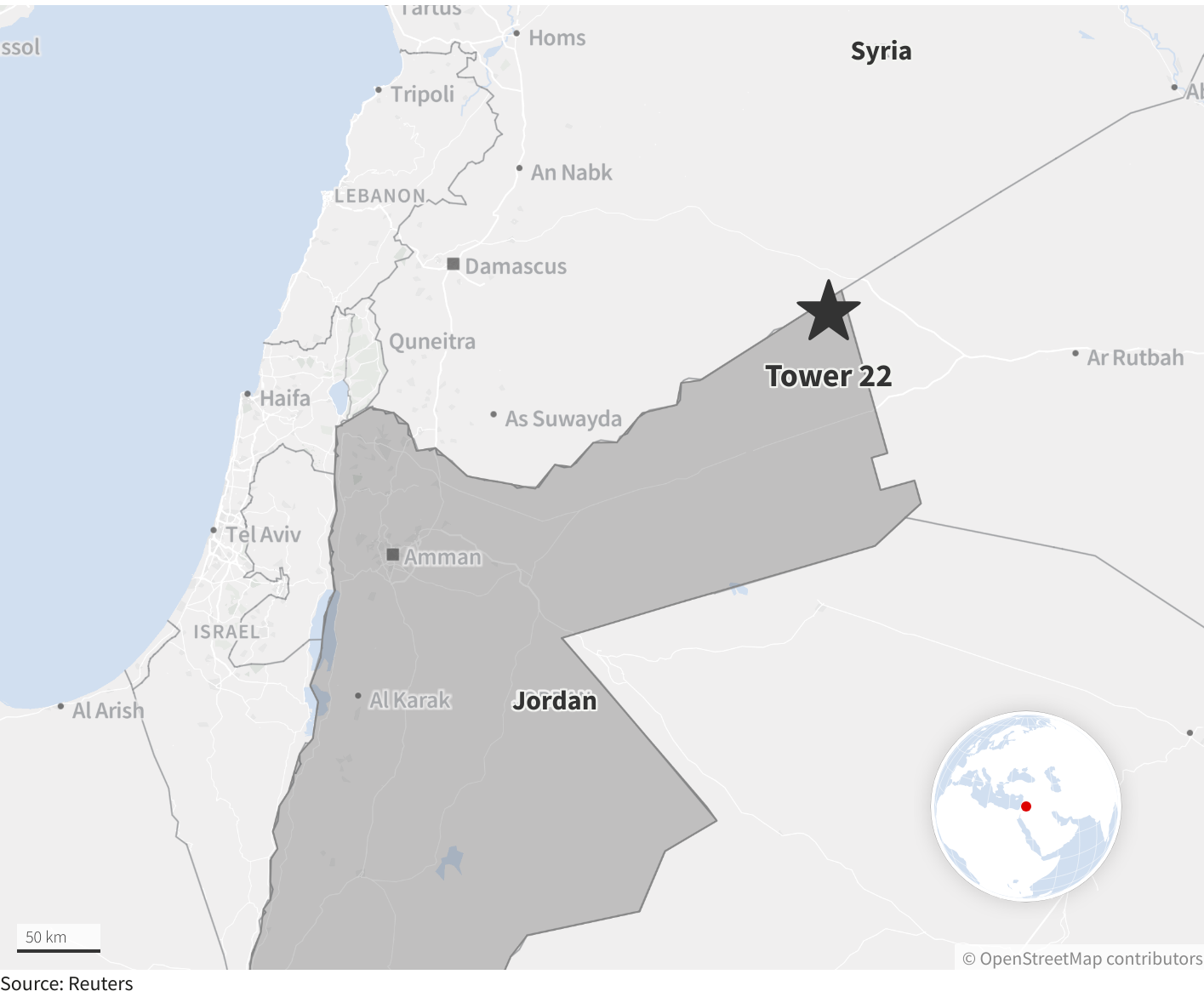 وهذا هو أعلى عدد من الضحايا تعترف به أميركا بعد حرب غزة؛ وتقول الولايات المتحدة إن الهجوم وقع في قاعدة “برج 22” في الأردن؛ في نقطة استراتيجية شمال شرق الأردن وبالقرب من الحدود السورية العراقية، وهي أيضاً على مسافة قصيرة من قاعدة التنف الكبيرة في سوريا، لا إطلاقاً، إلا أنها تقع بالقرب من قاعدة التنف التي هي أكبر قاعدة أمريكية في سوريا وتضم عددًا صغيرًا من القوات العسكرية الأمريكية. كما لا توجد معلومات عن نوع الأسلحة والدفاع الجوي المتمركز في القاعدة.