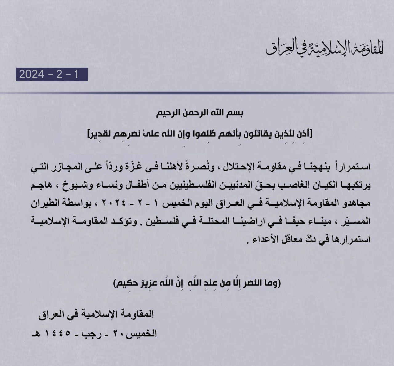 وفقًا لتقرير وكالة أنباء فارس المجموعة الدولية للمقاومة الإسلامية في العراق، صباح اليوم (الخميس 1 شباط) في بيان أعلنت فيه هجوم الطائرات بدون طيار على ميناء حيفا في الأراضي الفلسطينية المحتلة وأكد أنه تم “تحطيم النقاط الآمنة.. والعدو سيستمر”.