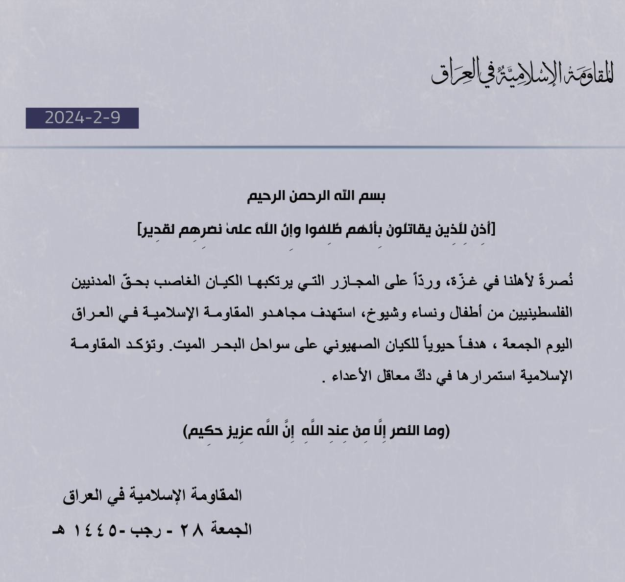 | أعلنت جماعة المقاومة الإسلامية في العراق، مساء الجمعة، أنها استهدفت، دعماً لشعب ومقاومتي غزة، هدفاً تابعاً للكيان الصهيوني على شواطئ البحر الميت. |