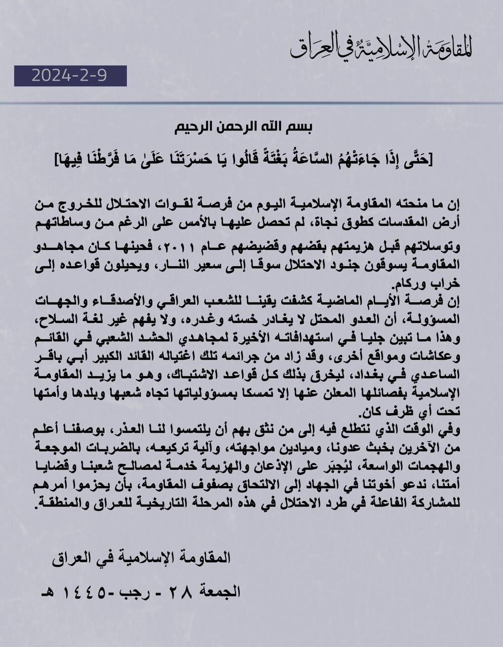 وفي استمرار لهذا البيان الجريمة الواضحة المتمثلة في يشار إلى أن استهداف أمريكا لمقاتلي الحشد الشعبي في القائم وعكاشات وأجزاء أخرى من العراق واغتيال القائد الكبير لهذا التنظيم أبو باقر الساعدي، هو “انتهاك واضح للجميع”. قواعد الصراع، ولهذا السبب فإن المقاومة العراقية عازمة على القيام بواجباتها تجاه الوطن والوطن تحت أي ظرف من الظروف.