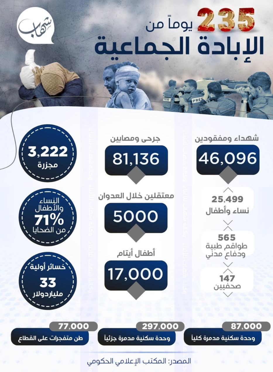 واليوم، بعد مرور 235 يومًا على بدء الاجتياح، أعلن المكتب الإعلامي لحكومة حماس في غزة آخر الإحصائيات المتعلقة بالحرب. |