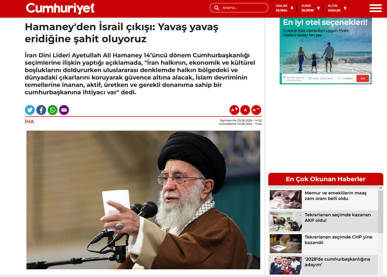 كما ركز الموقع الإلكتروني لصحيفة الجمهورية التركية على مسألة تراجع إسرائيل في خطابه بينما يعكس خطاب المرشد الأعلى.