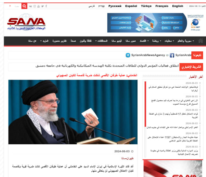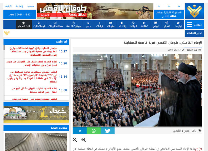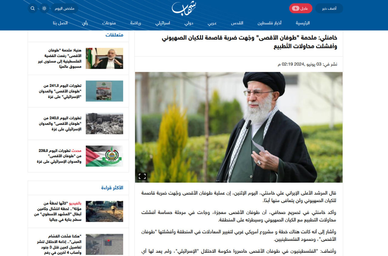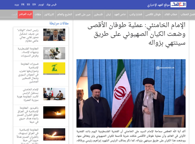 القسم الإنجليزي من موقع العربية مع انعكاس هذا الكلام على هذا القسم من التصريحات المرشد الأعلى الذي تحدث عن حاجة المنطقة لطوفان الأقصى عملية (7 أكتوبر) تم التركيز عليها.