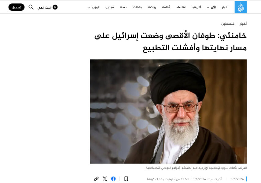 كما عكست شبكة الجزيرة خطاب المرشد الأعلى للثورة حول مسألة أن عملية طوفان الأقصى وضعت إسرائيل على طريق الانهيار والانهيار. كما فشلت قضية تطبيع العلاقات وركزت.