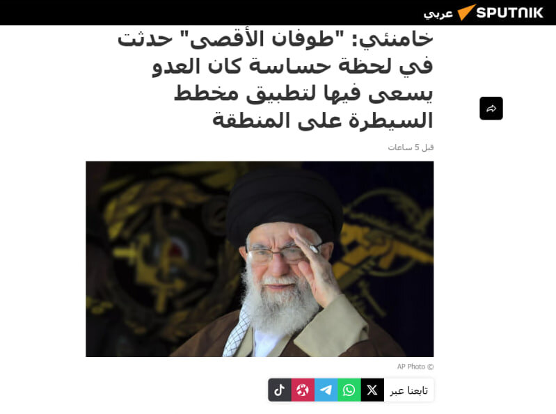 كما تناول موقع “سبوتنيك” الروسي هذا الجزء من تصريحات آية الله خامنئي التي شددت على “عملية طوفان الأقصى في الظرف الحرج الذي يمر به النظام الصهيوني”. ويحاول تنفيذ مشروع “السيطرة على المنطقة كان وحدث”.