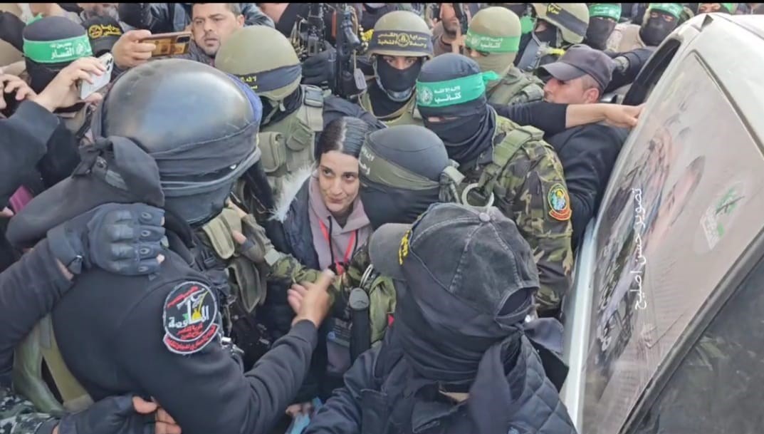 مقاتلي كتيبة القسام قبل ساعات في الجولة الأولى من الجولة الأولى من تبادل السجناء مع النظام الصهيوني في إطار اتفاقية توقف غزة ، أجام بيرغر ، الأسير العسكري للمرأة الصهيونية في جاباليا في شمال قطاع غزة ، تم تسليم الصليب الأحمر. “clearfix” class = “clearfix”/>