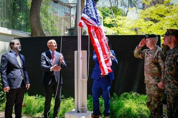 ورفع ⁣العلم الأمريكي‌ برفقة أسعد الشيباني، وزير الخارجية وشؤون المهاجرين في حكومة جولاني، عند مقر إقامة السفير في دمشق.