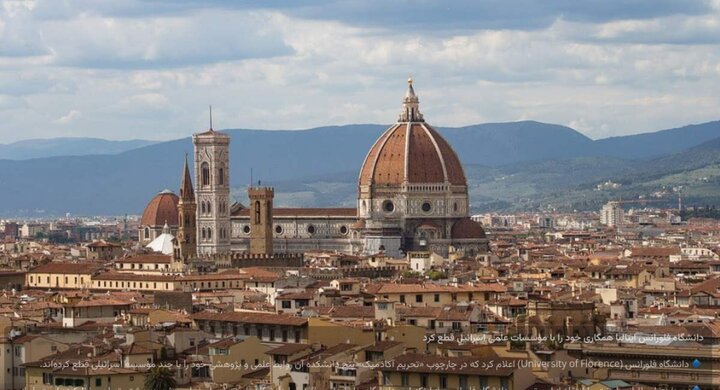 ذكرت وكالة ”ويبانقاه للأنباء” العربية نقلاً عن “وكالة مهر للأنباء” ومركز الإعلام الفلسطيني، أن جامعة فلورنسا الإيطالية أعلنت تعليق تعاونها مع المؤسسات الأكاديمية الصهيونية ردًا على جرائم النظام الصهيوني في غزة والضفة الغربية. وفقًا لتقارير إعلامية إيطالية، قررت 5 كليات بالجامعة منها كليات الرياضيات وعلوم الحاسوب والهندسة والعلوم الزراعية والعمارة والعلوم السياسية والاجتماعية إنهاء علاقاتها العلمية والبحثية مع الكيان الصهيوني.
