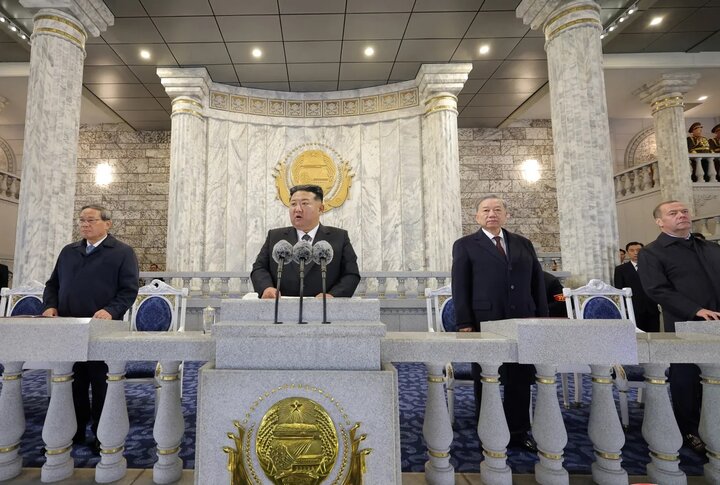 كان ديمتري مدفيديف، نائب مجلس الأمن الروسي وحليف مقرب للرئيس فلاديمير بوتين، إلى جانب لي تشيانغ رئيس وزراء الصين وكذلك تو لام الأمين العام للحزب الشيوعي الفيتنامي الذين جلسوا جميعاً بجانب كيم جونغ أون حاضرين في هذا العرض العسكري.