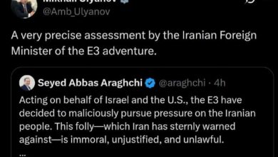 كتب ممثل روسيا في المنظمات الدولية تغريدة قال فيها إن تقييم وزير خارجية إيران لإجراءات الأوروبيين دقيق للغاية