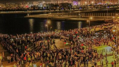 احتشد آلاف المغاربة في ميناء طنجة احتجاجا على رسو سفن تنقل أسلحة تابعة للاحتلال الإسرائيلي